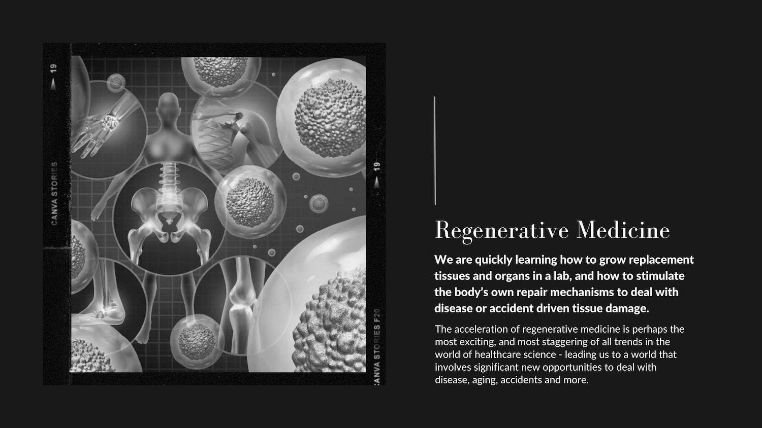 The acceleration of regenerative medicine is perhaps the most exciting, and most staggering of all trends in the world of healthcare science - leading us to a world that involves significant new opportunities to deal with disease, aging, accidents and more."