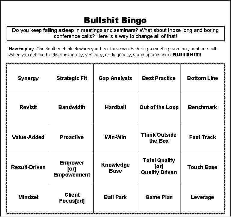 People would take them into meetings, and cross off a square when a particular buzzword or phrase was used. Once you completed a line, you would quietly mutter "bullshit" under your breath. Good times - the craze swept corporate meetings and events for quite some time, and leaders really had no idea that their team was secretly laughing at them!