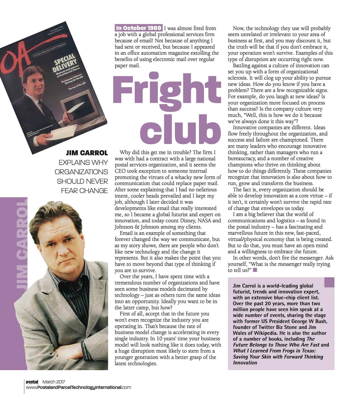 Back to the story about how I was almost fired - it was shared many years later in another article that appeared in Postal and Parcel Technology Magazine. They approached me to write an article about the future of mail in the era of technology, and particularly, e-mail."Why did this get me in trouble? The firm I was with had a contract with a large national postal services organization, and it seems the CEO took exception to someone internal promoting the virtues of a whacky new form of communication that could replace paper mail."