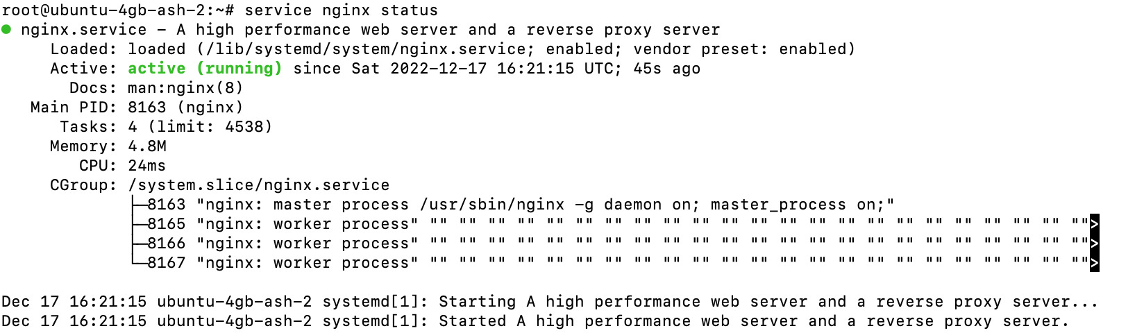 It doesn’t hurt to check that you don’t have any error messages - so a good service nginx status command will give you what you need.