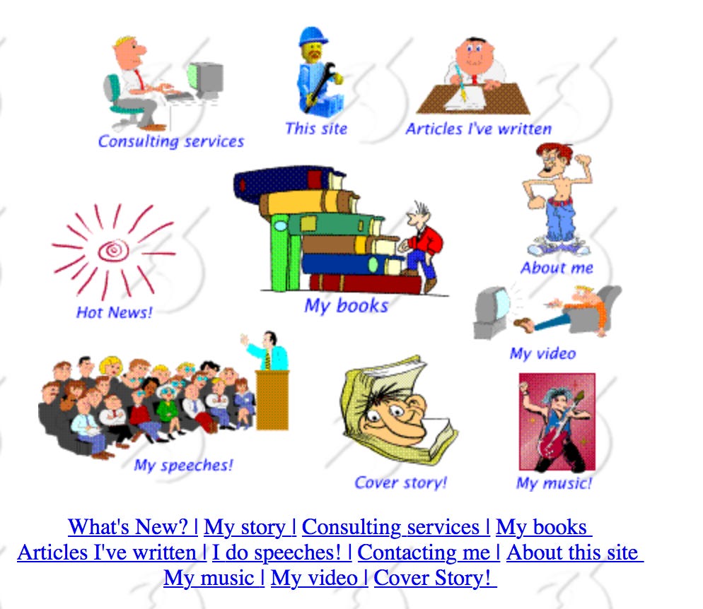 But seriously, my lack of creative design skills has always been an issue for me and I think have hampered my overall success; I do remember visual art in school becoming an excruciating and painful period of time. This lasted through to the evolution of my strange career - as computers became prevalent and digital design became a thing, I was clearly lacking. When PowerPoint came along and I needed to rely on the use of slide decks in my talks, I was really good at designing bad designs and had to rely on others to do the design for me. That same deficiency flowed through to the Web - my early attempts at creativity were but a joke, such as this version of my Website which I put together in 1994 with a clip art program.