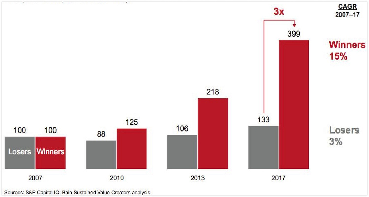 Second, those ‘winners’ locked in gains of 13% CAGR in the years after the downturn compared to the ‘losers’ stalling at 1%.