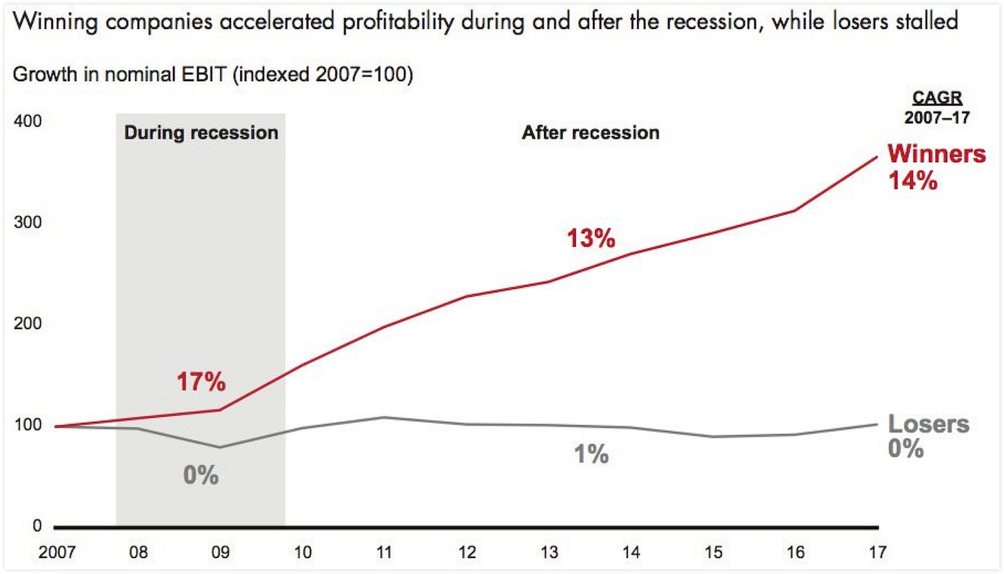 Here are two key things we learned from the 2008-09 global economic meltdown. First, 'winners' grew at a 17% compound annual growth rate during the downturn compared to 0% among the ‘losers.’
