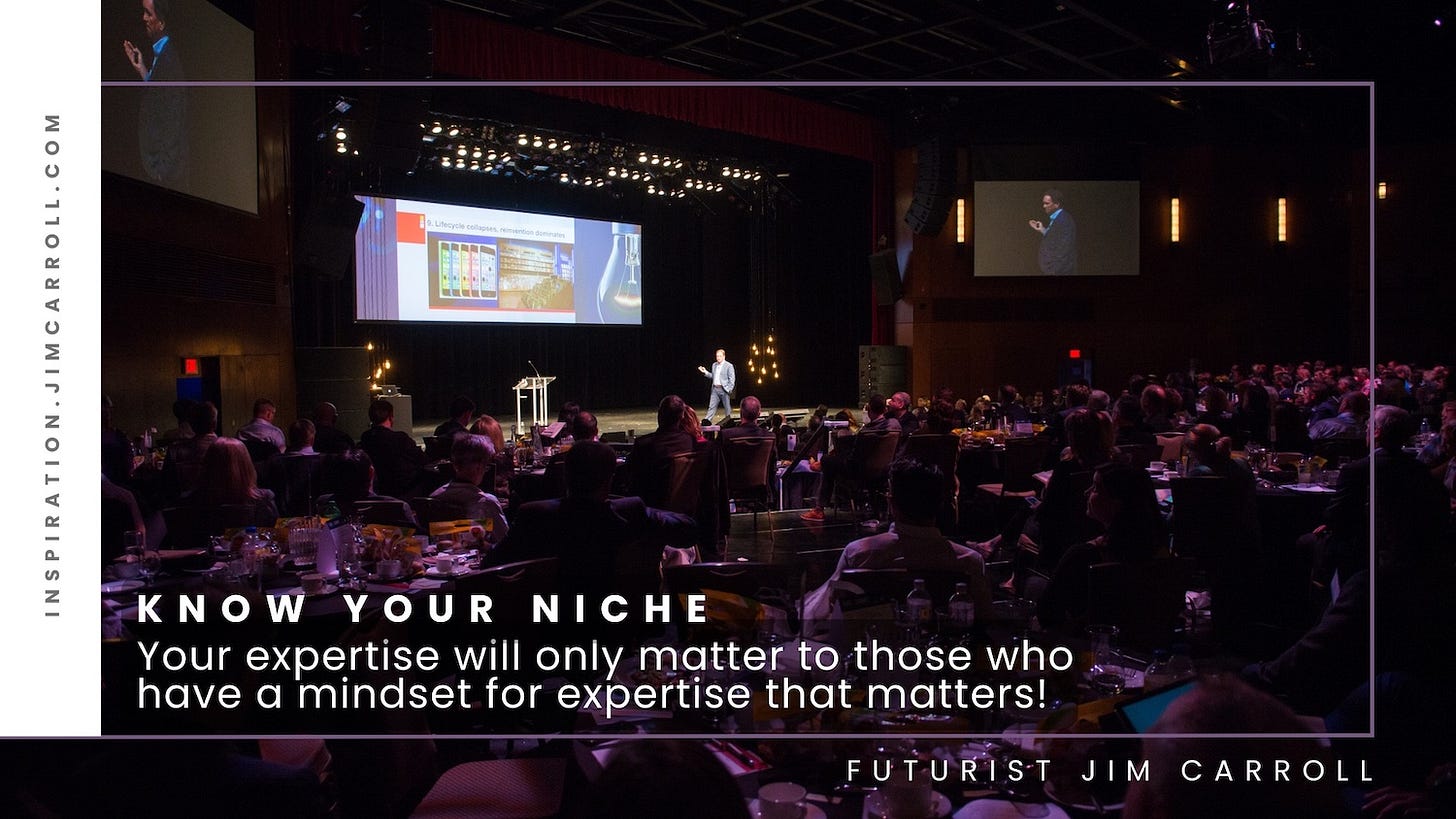 Years ago, I realized that my key expertise - my niche - was my ability to dig deep into any complex trend topic and provide that deep insight in a way that makes strategic sense to the audience. This has involved such things as going into NASA (twice) for a look at the future of the space industry when privatization was accelerating and disrupting; the PGA of America when the next generation of tech-enabled golfers was beginning to have a dramatic impact on the game; or Disney when the very nature of the global engine of creativity and innovation as changing. Somehow I've developed a skill - a niche - of providing 'strategic clarity' around very unique and complex issues. This insight is priced accordingly - those with a 'niche' can often set the terms.