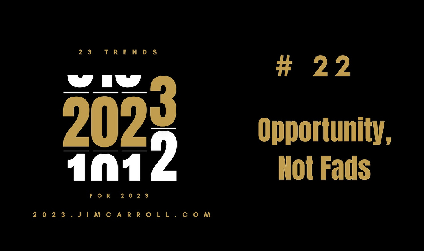 Going into 2023, we've managed to turn off the engine of technology overhype for a time, and that is a good thing! The result is that I believe many organizations will be focusing much more of their strategic thinking time on the real trends that matter, and not chasing the 'shiny objects' of unrealistic trends that might never have an impact. That's why trend #22 of my "23 Trends for 2023" series is Opportunity, Not Fads. It comes in the wake of trend #1, Techno-skepticism.