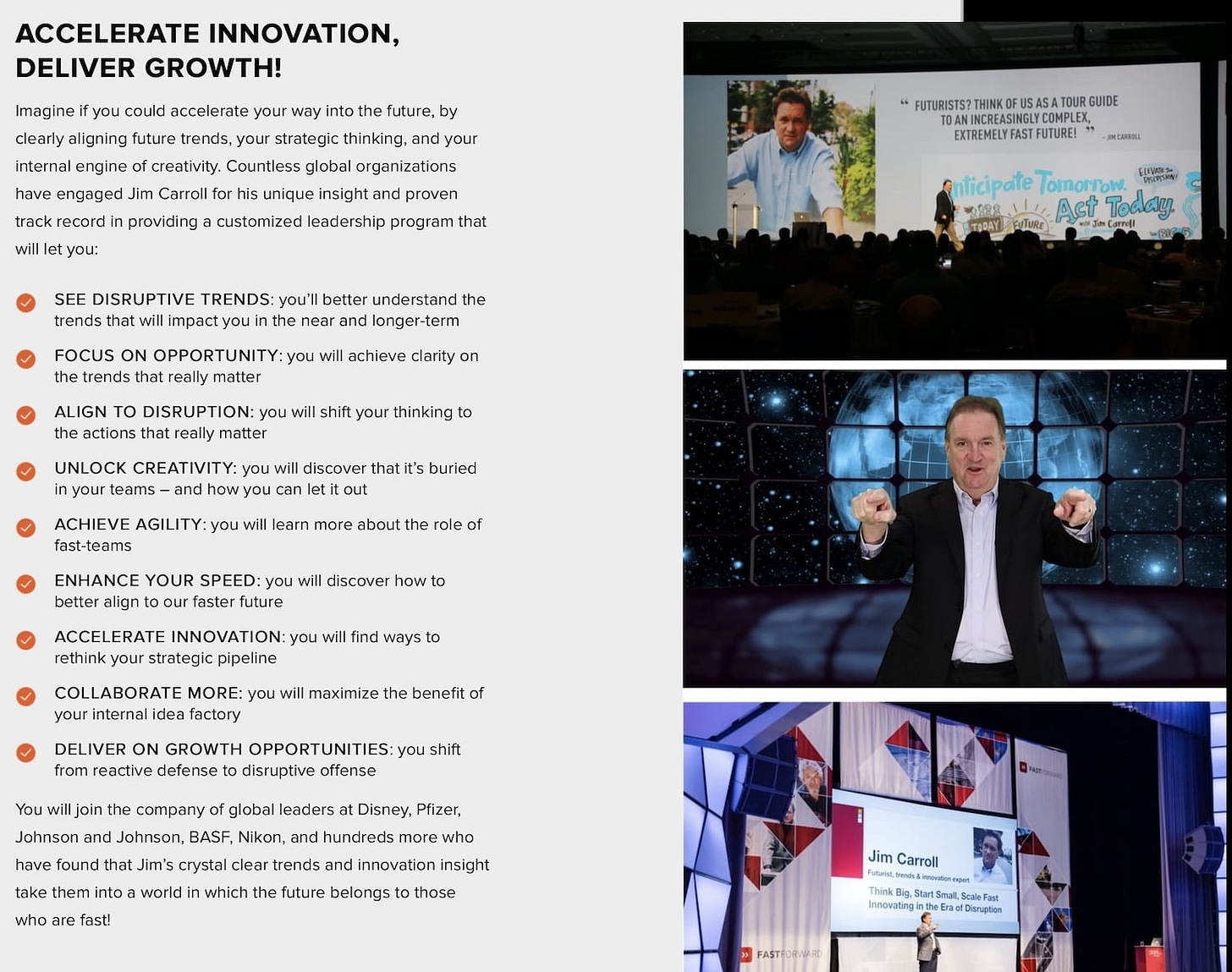 “Imagine if you could accelerate your way into the future, by clearly aligning future trends, your strategic thinking, and your internal engine of creativity. Countless global organizations have engaged Jim Carroll for his unique insight and proven track record in providing a customized leadership program that will let you: