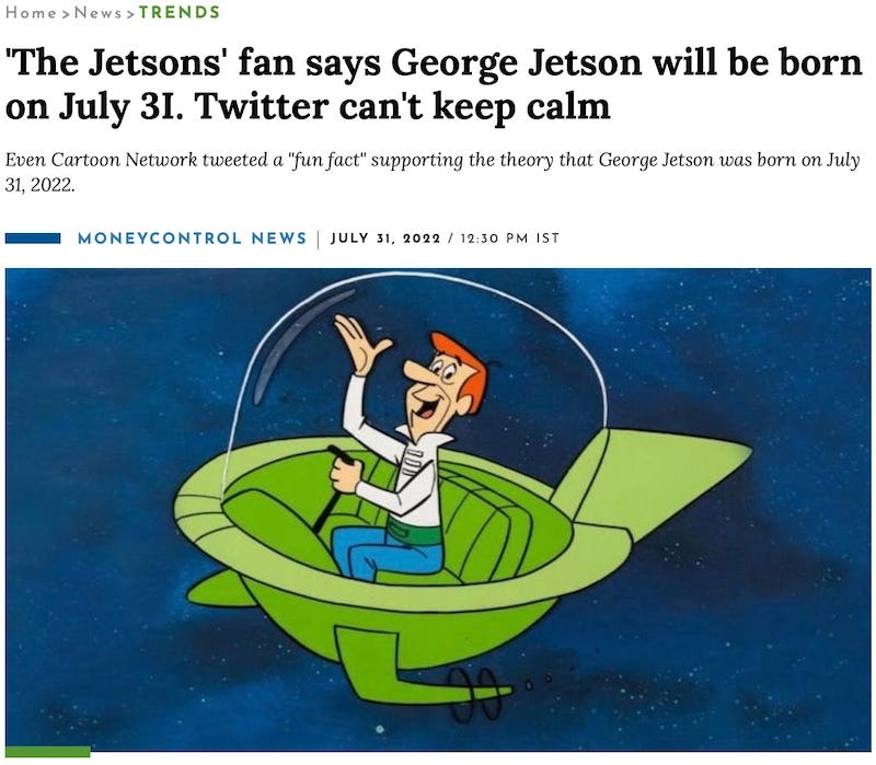 Apparently, George Jetson arrived on this planet yesterday. Twitter was abuzz with this information, and given that I've spent so much time on stage talking about The Jetsons, countless people were letting me know.