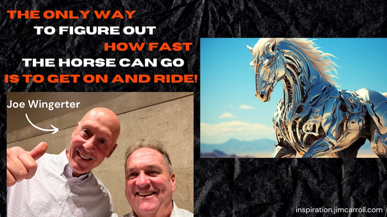 All of this generated a lively discussion with the group, with many questions being tossed in, and a few suggestions along the way. At one point, this fellow Joe simply shouted out the comment "The only way to figure out how fast the horse can go is to get on and ride!" which completely and totally captured the attention of the room. I knew at that very moment I had seen a flash of brilliance and made sure to keep the idea in mind. After all, his point was that the only way to figure out how AI is going to change your world - and there is no doubt it will do that - is to get involved with it, work with it, and figure out what is going on.