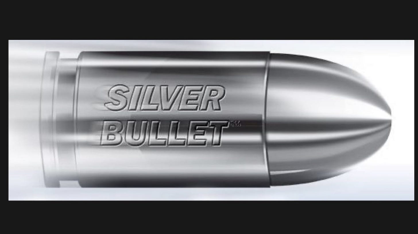 The image seemed kind of lame, and since I was evolving my deck so that it was mostly using AI-generated art, I decided to ask MidJourney - the text-to-image AI that I am using for such purposes - to generate for me a 'silver bullet.' It gave me this image.