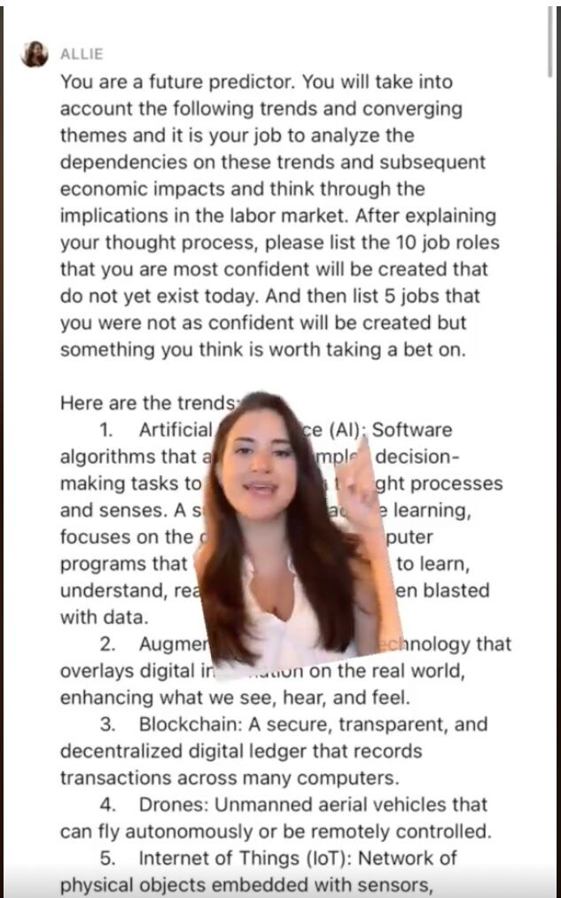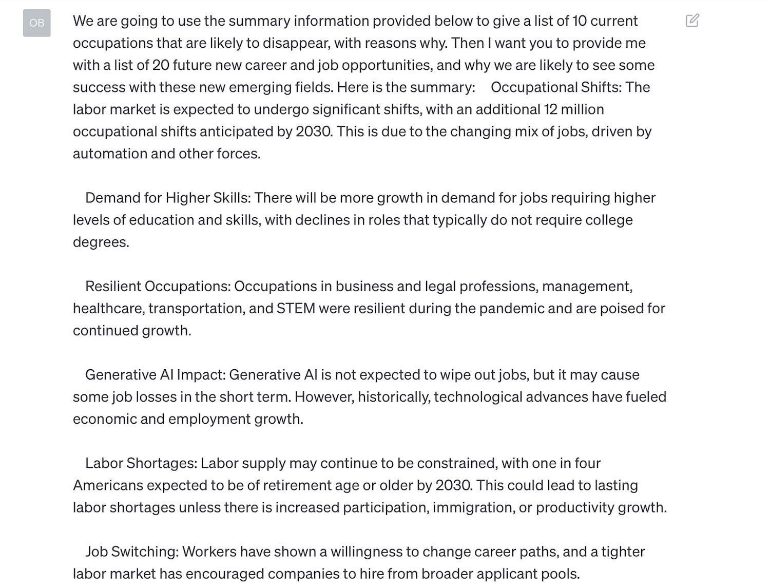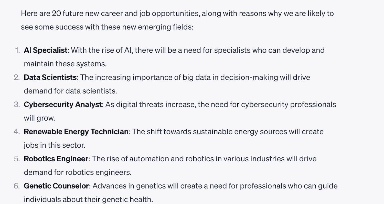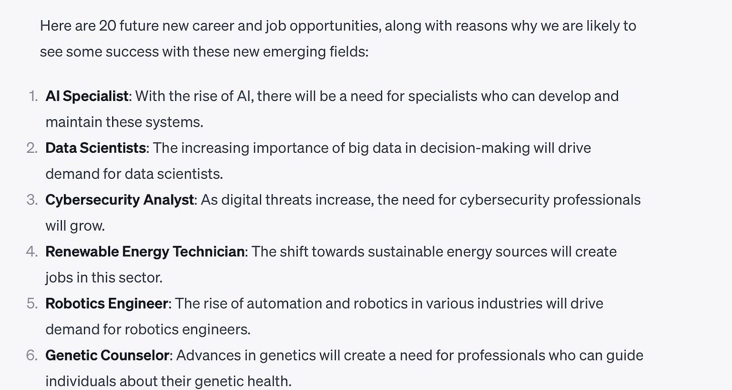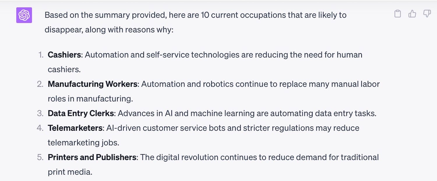 I then went to my next question - using the information above, build me a prediction as to 10 types of occupations that are likely to disappear, and a list of 20 new future career and job opportunities. You'll see where I typed in my query and then pasted in the above summary.