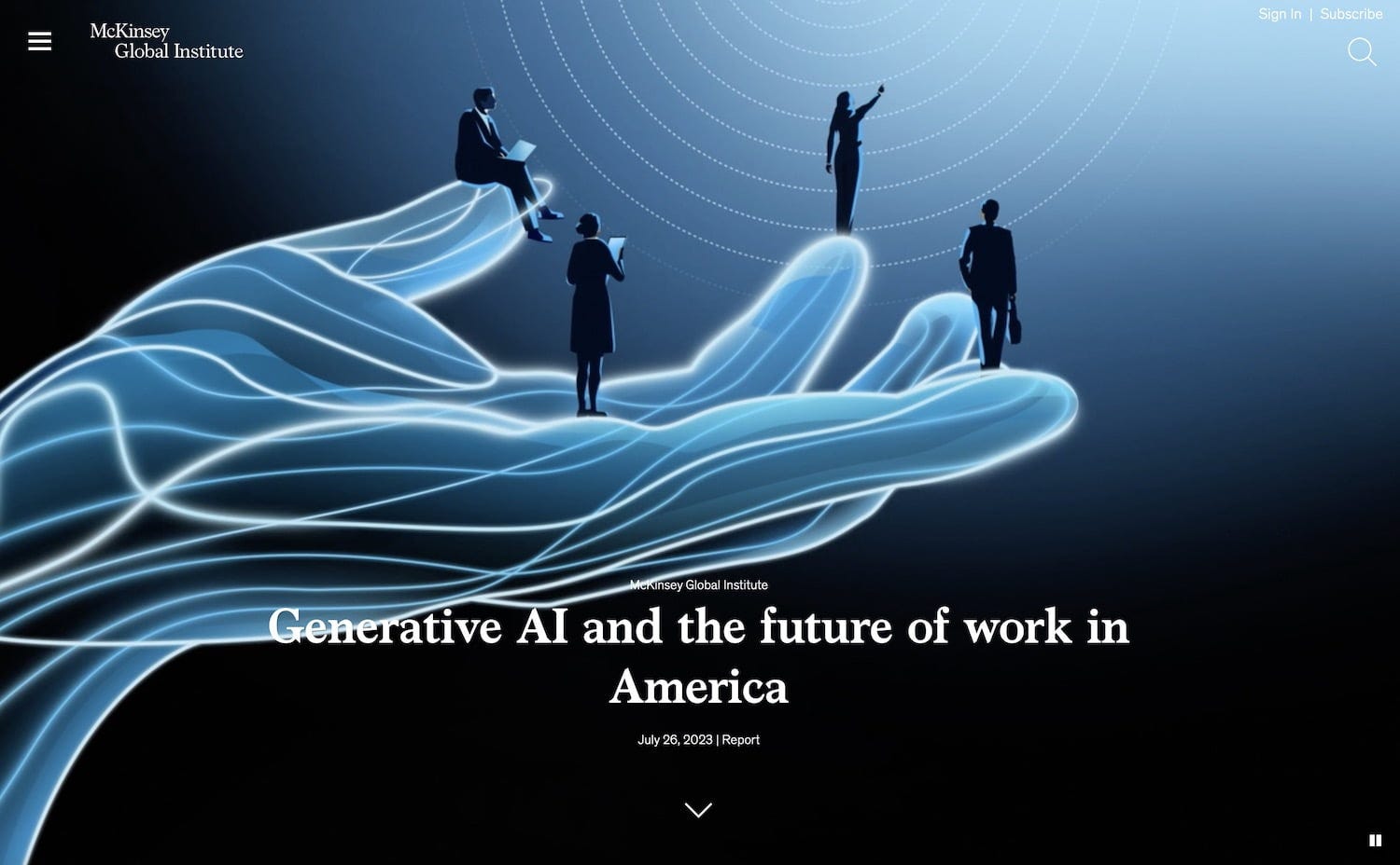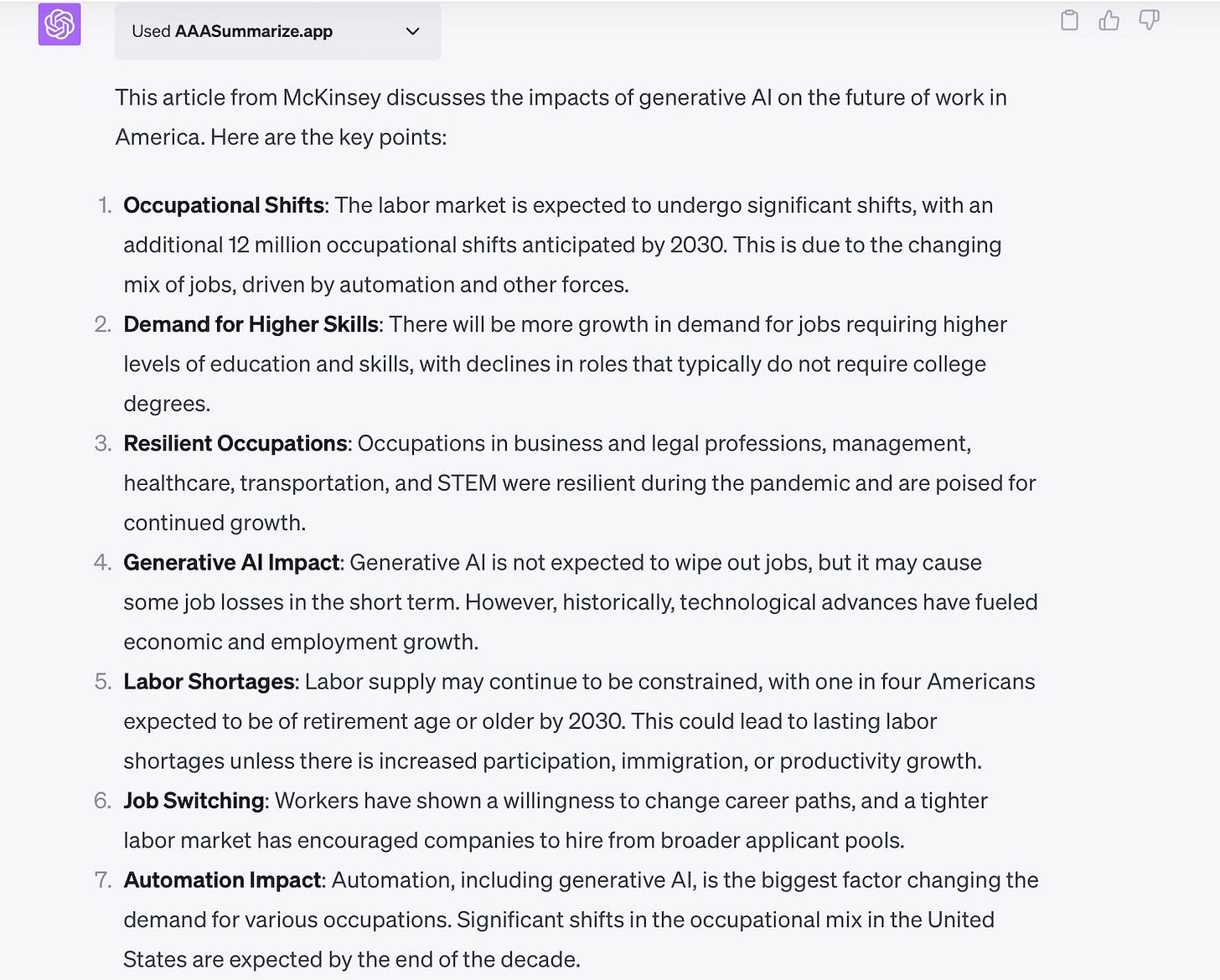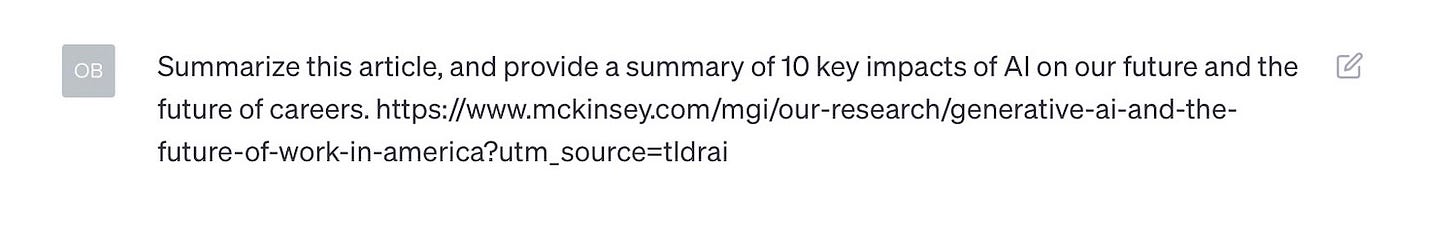 Here's the scenario. I came across a long McKinsey report, "Generative AI and the future of work in America." I was intrigued by the article and wanted to know what it might tell me, but was in a bit of a rush. Plus, being a futurist, I wanted to use the insight in the article to give me a prediction about what new jobs and careers might emerge in the future, and what existing jobs and careers might disappear.