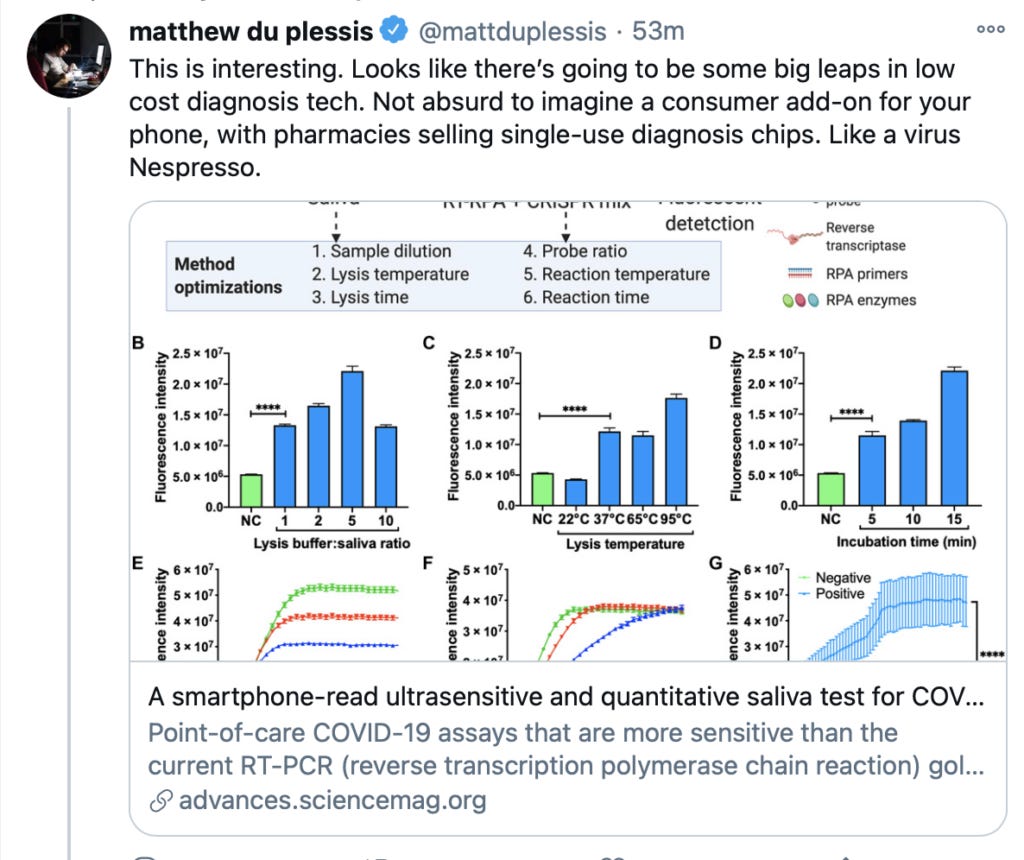 The same thing happened in the world of science and healthcare. I grabbed this screenshot in mid-April 2020 - it was one of many emergency room doctors I was following online because I realized that small communities of specialists were forming online in order to share insight on how to deal with fast-moving and entirely unknown new circumstances. Something profound was happening in the world of medical science, and I wanted to understand it.