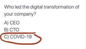 This goes to one of my key points - that the pandemic accelerated the goal of many organizations to focus on 'digital transformation - that is, how do we align our workforce, supply chain, operating methodologies, and more to take advantage of the opportunities that widespread connectivity presents us. Organizations have talked about this goal for years - the pandemic simply accelerated the trend to a HUGE degree. I remember seeing this on Twitter early into the pandemic.