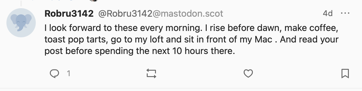 Last week, I posted one of my Daily Inspiration posts in advance to the social network Mastodon, seeking a little bit of commentary on what I was planning to write the next day. In my short post, I noted how I've now been writing these daily posts for well over 7 years, and wondered aloud how many people actually read them. Unsolicited, this comment came back to me from someone with the username Robrus3142: