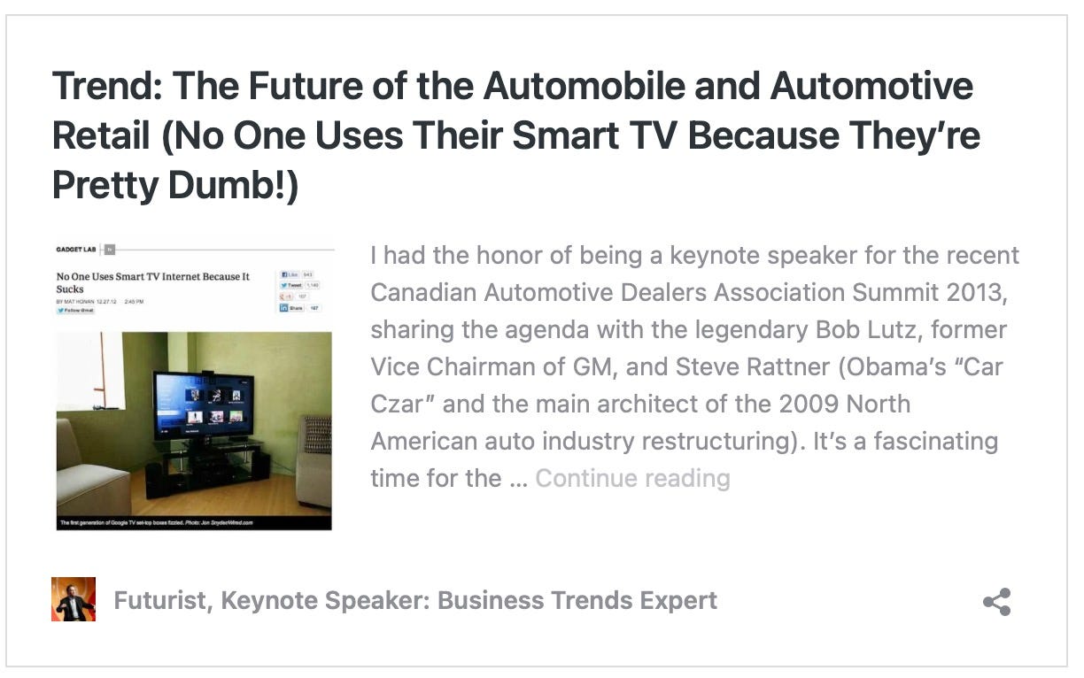Car companies are now making the same mistakes that TV manufacturers made. The result is that it is obvious that car companies simply don't know how to design a car anymore because the rules have changed. Sadly, they will keep on doing what they've always been doing because that's what they do! The result? Failure. Consider this comment in 2012 as to what car companies were already doing with their design failure.