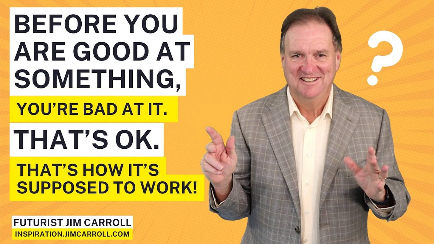 And it's when you Try that magical things begin to happen. You won't get it right the first time but can come to realize that you might eventually get it right. You won't know what you are doing right off the bat, but clarity will start to emerge as you continue to iterate your iterations. Your knowledge will be pretty low when you begin but ti will only improve the more you keep going at whatever it is you are going at. Your insight will be fuzzy when you begin but you will begin to achieve clarity when you can visualize each successive step along your path. And that's where the idea that "before you are good at something, you'll be bad at it." Because "that's OK. That's how moving forward and innovation is supposed to work!"