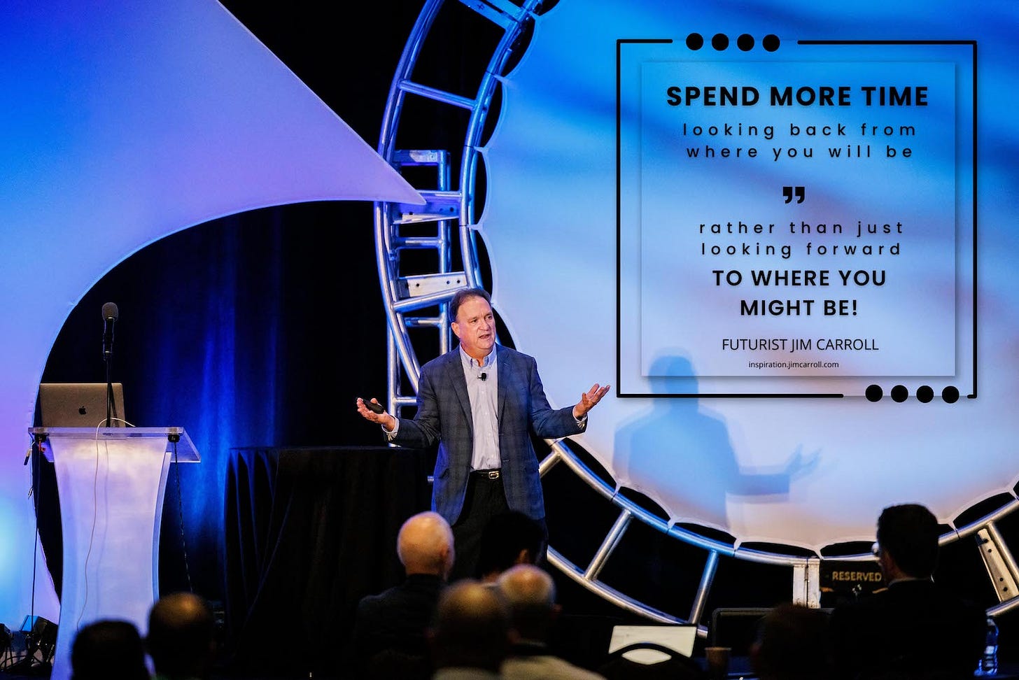 Note: I decided that as I begin to return to real stages, it's time to start making use once again of various real stage photos - so I'll go back and forth between formats! This particular photo is from a manufacturing event I opened in Atlanta back in May; I was challenging the audience to imagine what they would be thinking if it was 2030, and they were imagining what our world was like then compared to today.