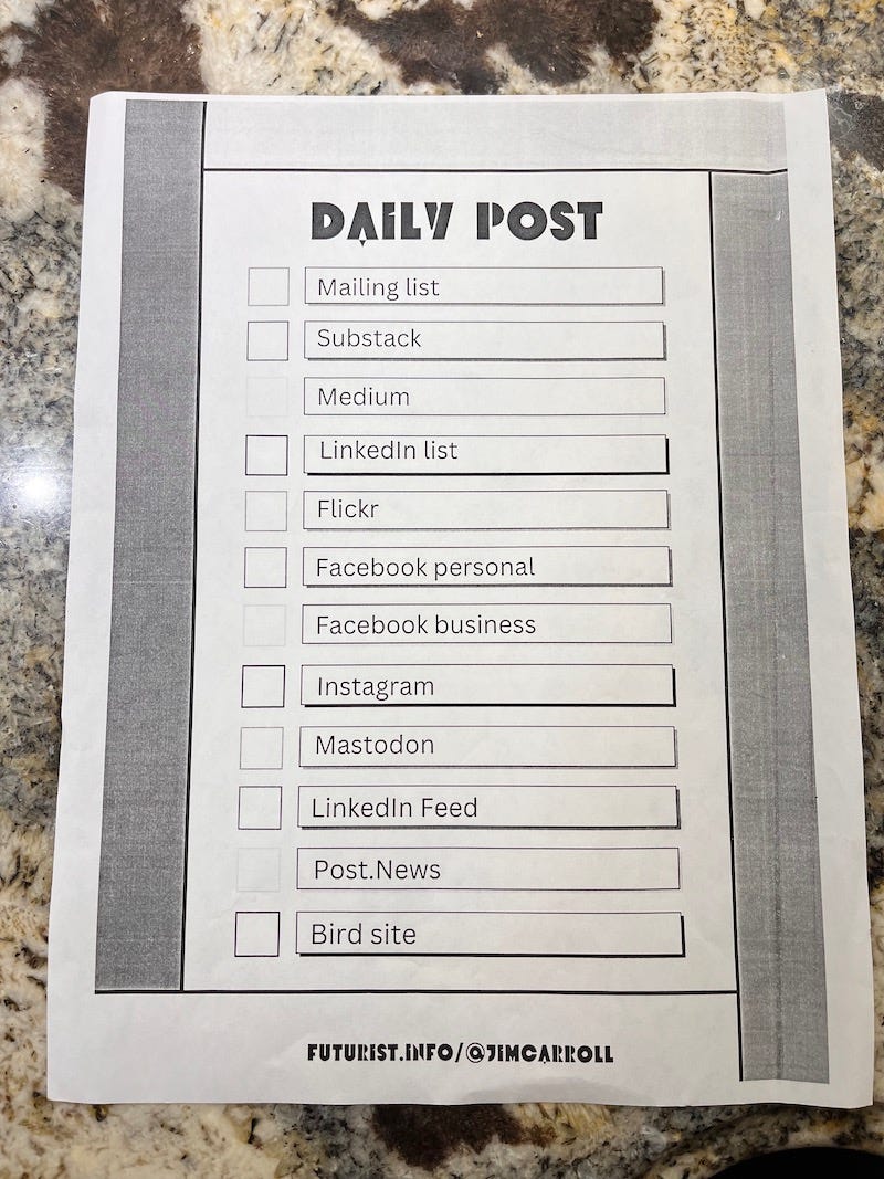 the posts go out each morning to multiple networks - in addition to being posted here on my blog, they also go out to several thousand people on a mailing list, as well as to mailing lists on Substack, Medium, and LinkedIn. In addition, they make their way to a LinkedIn post, my personal Facebook page, my business Facebook page, my Flickr account, Instagram, and Mastodon.