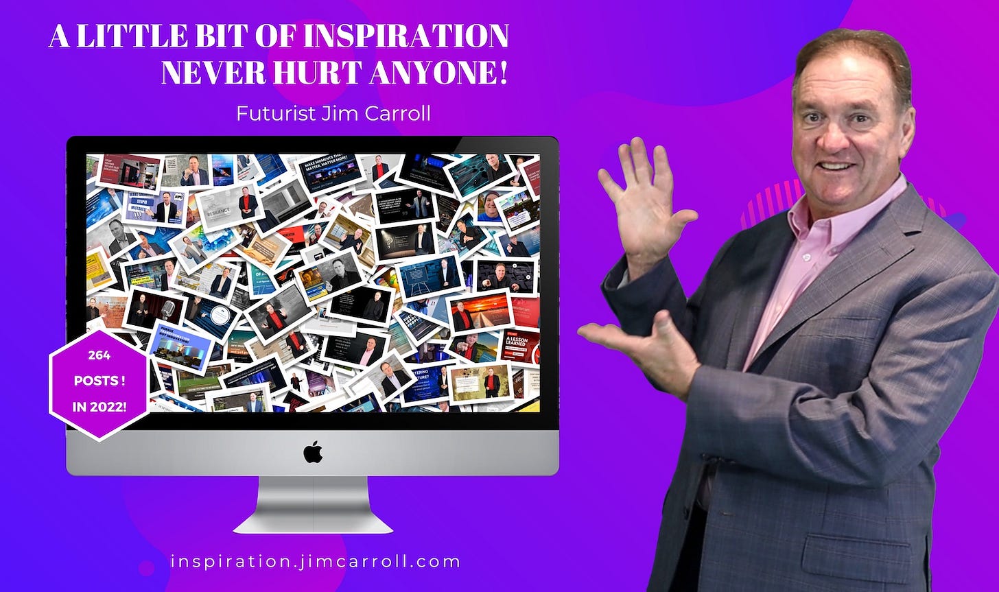 What kept me sane through the twists and turns that defined 2021? Mindset matters! And one of the ways I accomplish that is by pausing with a moment of reflection, each moment, as I start my day. That involves writing one of these each Daily Inspirations each and every workday. It's ALWAYS the first thing I do as I start my day, between 5 and 6 am... my laptop, some coffee, some quiet thinking, as I reflect my thinking on our world, innovation, creativity, future trends, or just plain inspirational thinking.