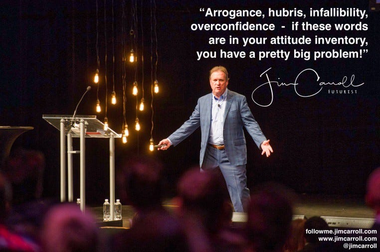 Quote: “Arrogance, hubris, infallibility, overconfidence - if these words are in your attitude inventory, you have a pretty big problem!” - Futurist Jim Carroll