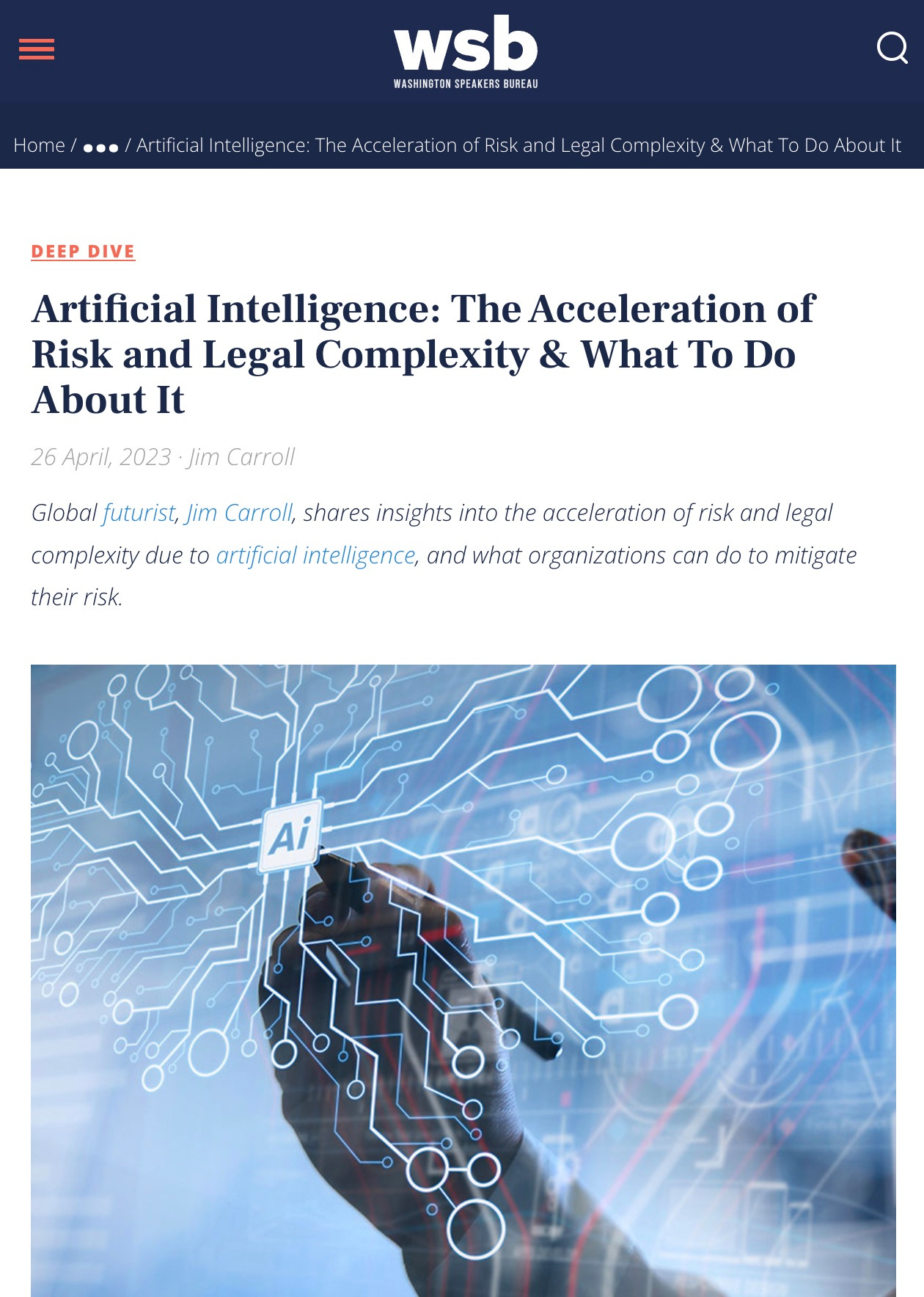WSB - or Washington Speakers Bureau - ran my article about the massive legal and other risks with AI, "Artificial Intelligence: The Acceleration of Risk and Legal Complexity & What To Do About It." [link [