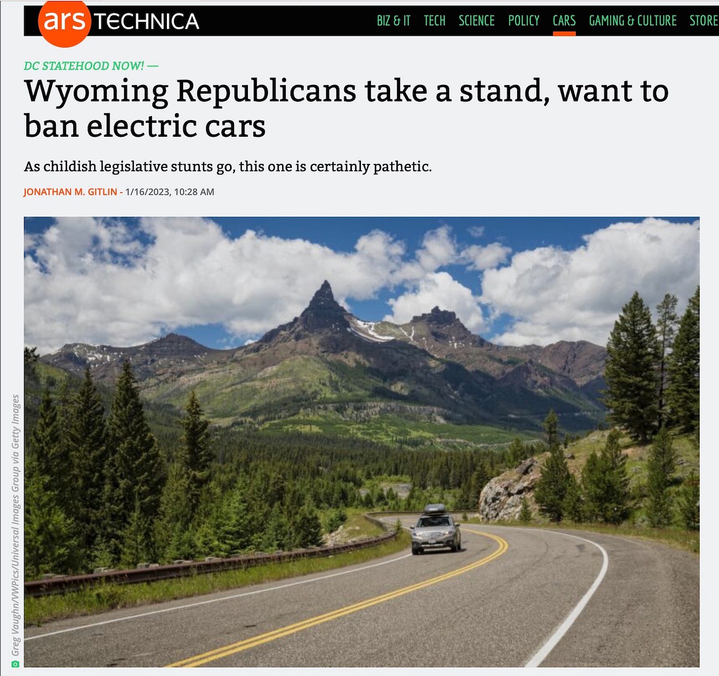 You might have noticed earlier this week that out in Wyoming, a rather innovative approach to the future was proposed by the Republicans - 'lets' ban electric cars!' The reason? It would be good for the economy, which is heavily carbon-based. Besides, it would own the libs out in California, where plans are in place to mandate electric vehicles some years out! Grievance politics, I suppose, is an addiction for some.