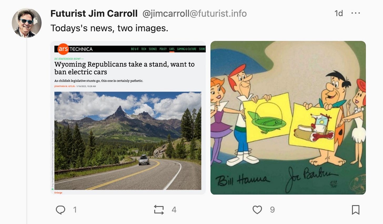 My post used one of my favorite screenshots, where the Jetsons present to the Flintstones their vision for the future, and Fred clings to his past. That, to me, summarizes the attitude of many people when it comes to the future, and to me, that applied in this case. It's a fantastic visual image that seems to echo so much of what is going on in our world today.