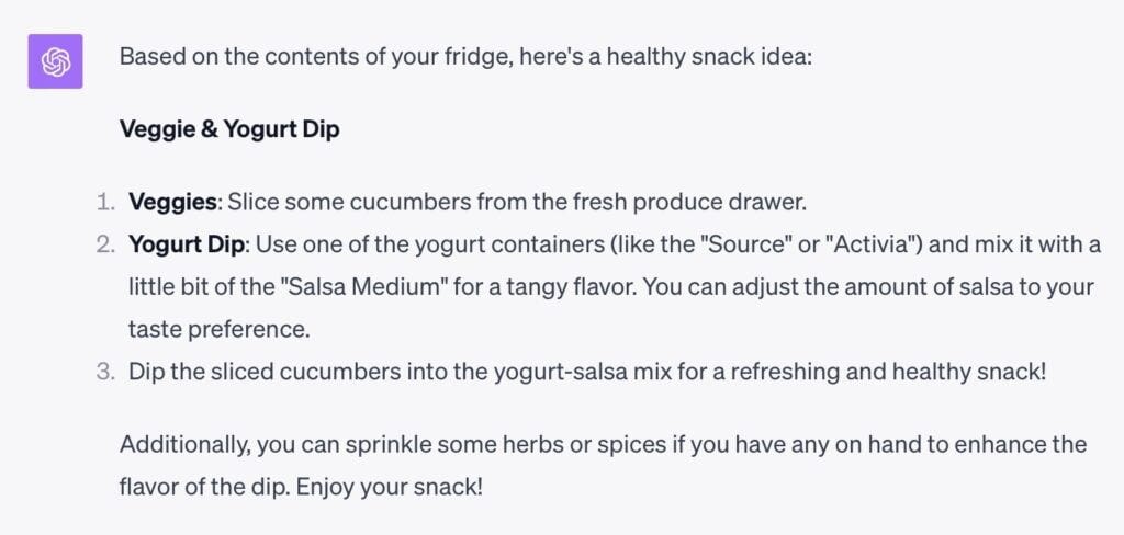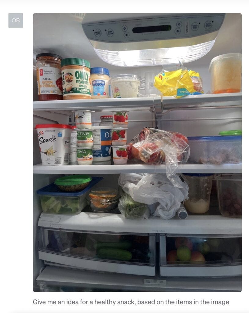 Using your phone, go take a picture of something; for example I took a picture of our fridge contents - and asked for an idea on a healthy snack, based on what ChatGPT sees in the image.