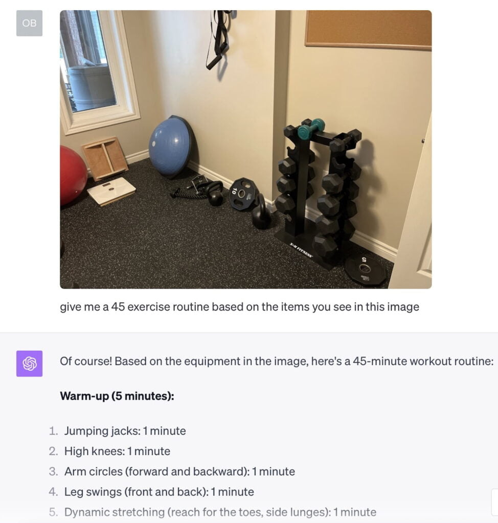 Next, while working out in my home gym, I asked it to take a look at a bit of my gym equipment, and generate a workout plan based on what it saw.