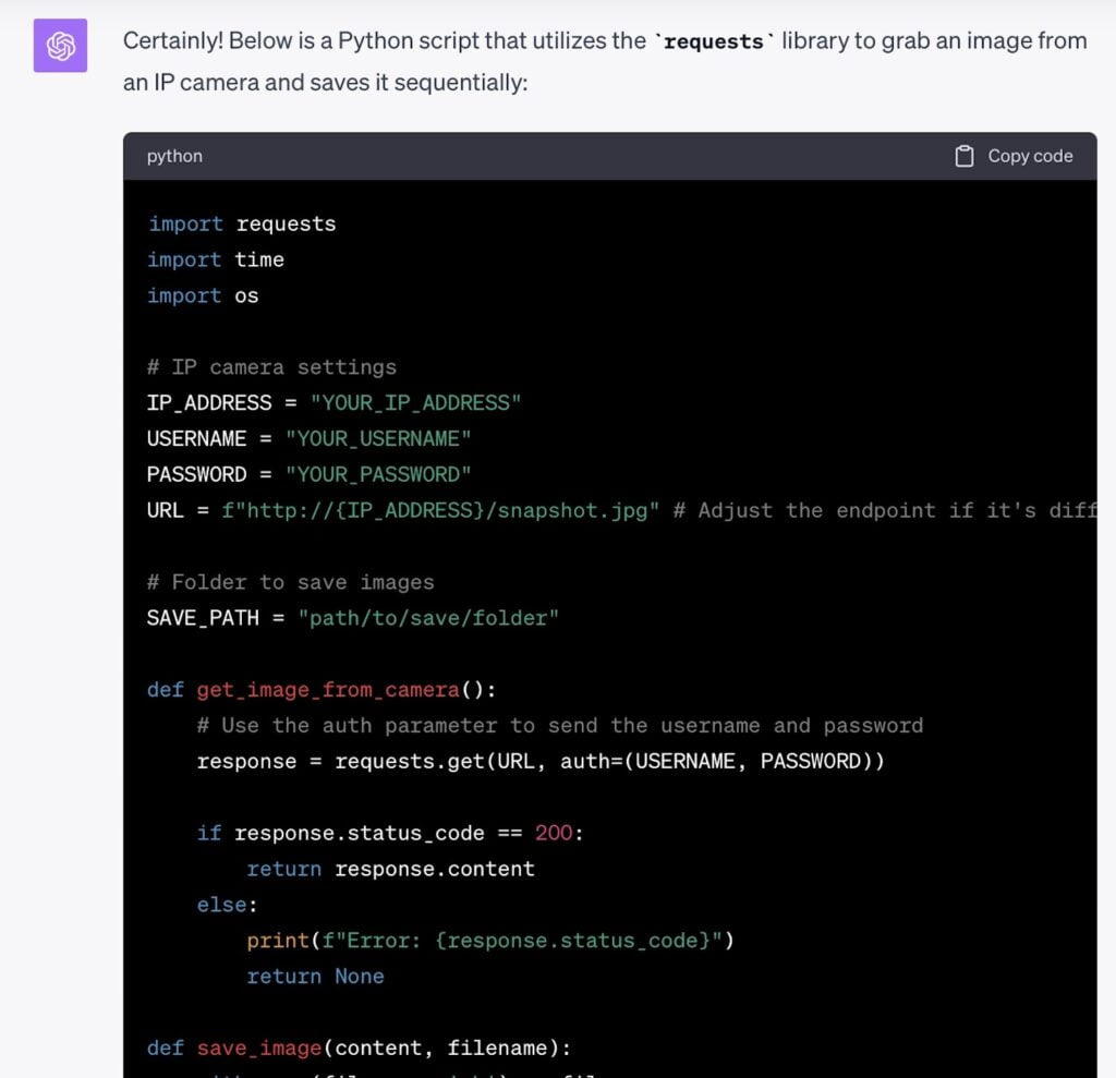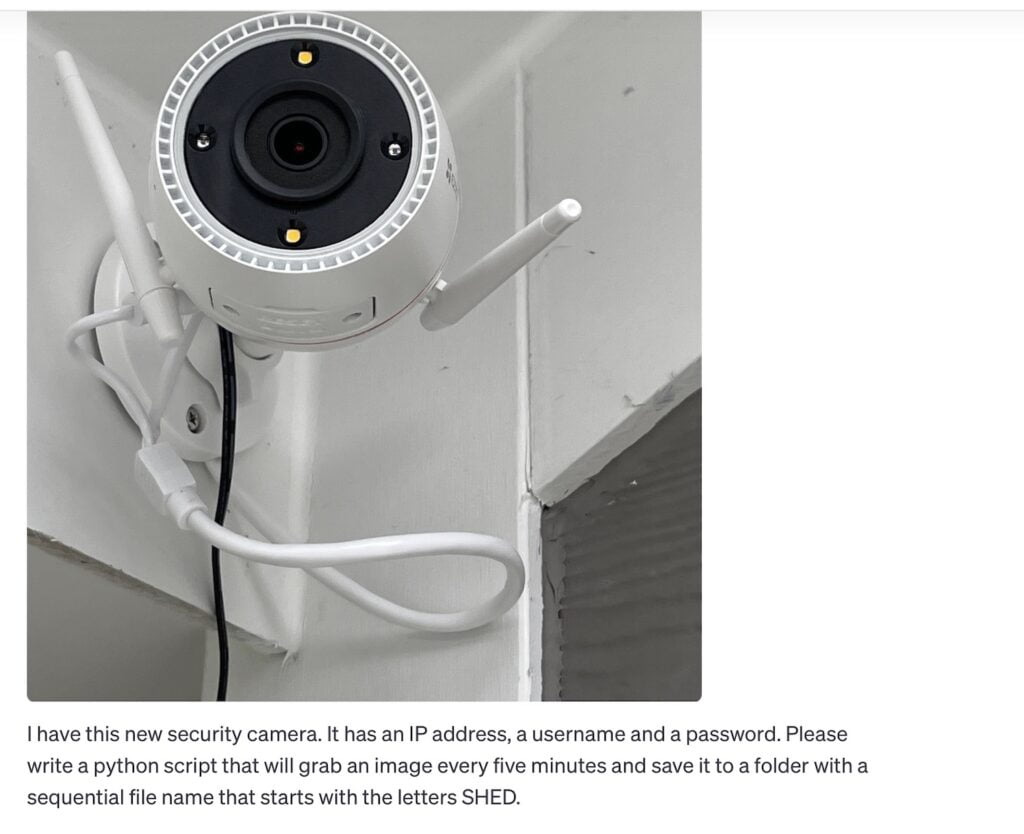 Then, I aimed it at one of the security cameras I have in place, asking if it might write me a program in Python (a programming language) that I could use to automatically grab an image every 5 minutes and store it on one of my home servers.