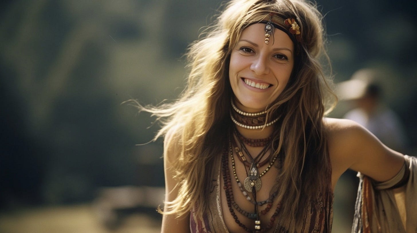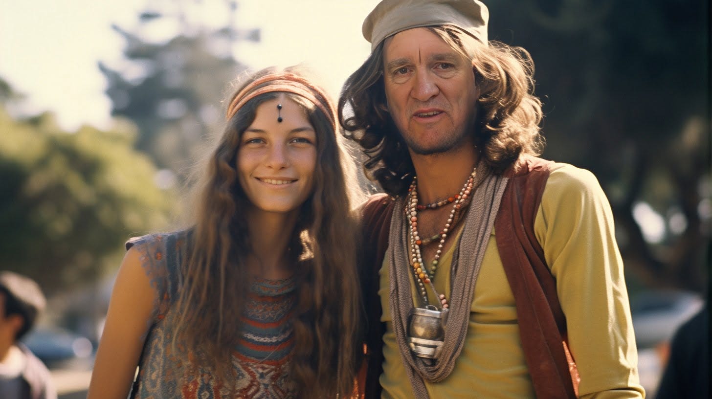 My wife finds the whole image face-swap generation thing kind of creepy, and there is much to learn. I haven't quite figured out how to do two face-swaps, and so end up with some random AI person. With that in mind, here is my beatiful wife back in her flower-child days - stunning then, and stunning today.