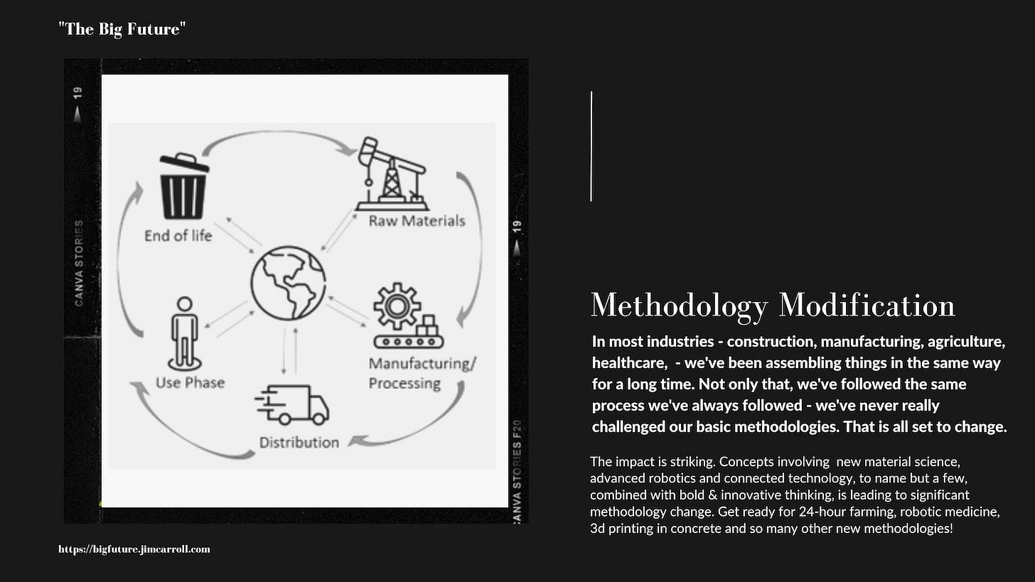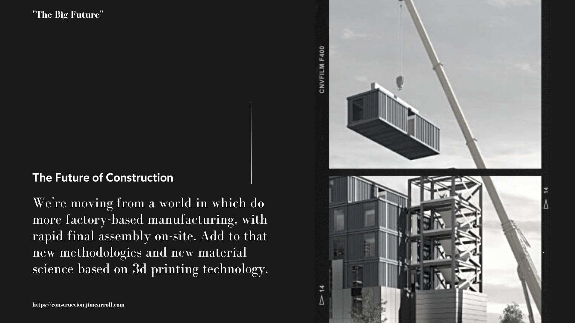 In the construction industry, this 'methodology modification' will represent one very fundamental shift occurring in the industry - to a world in which more of the process of assembling structures will occur offsite, utilizing robotic assembly line methodologies. In addition, it involves far more use of advanced robotics and other technologies for final assembly on site. In other words, changing the very nature of the way that much of the construction process happens.
