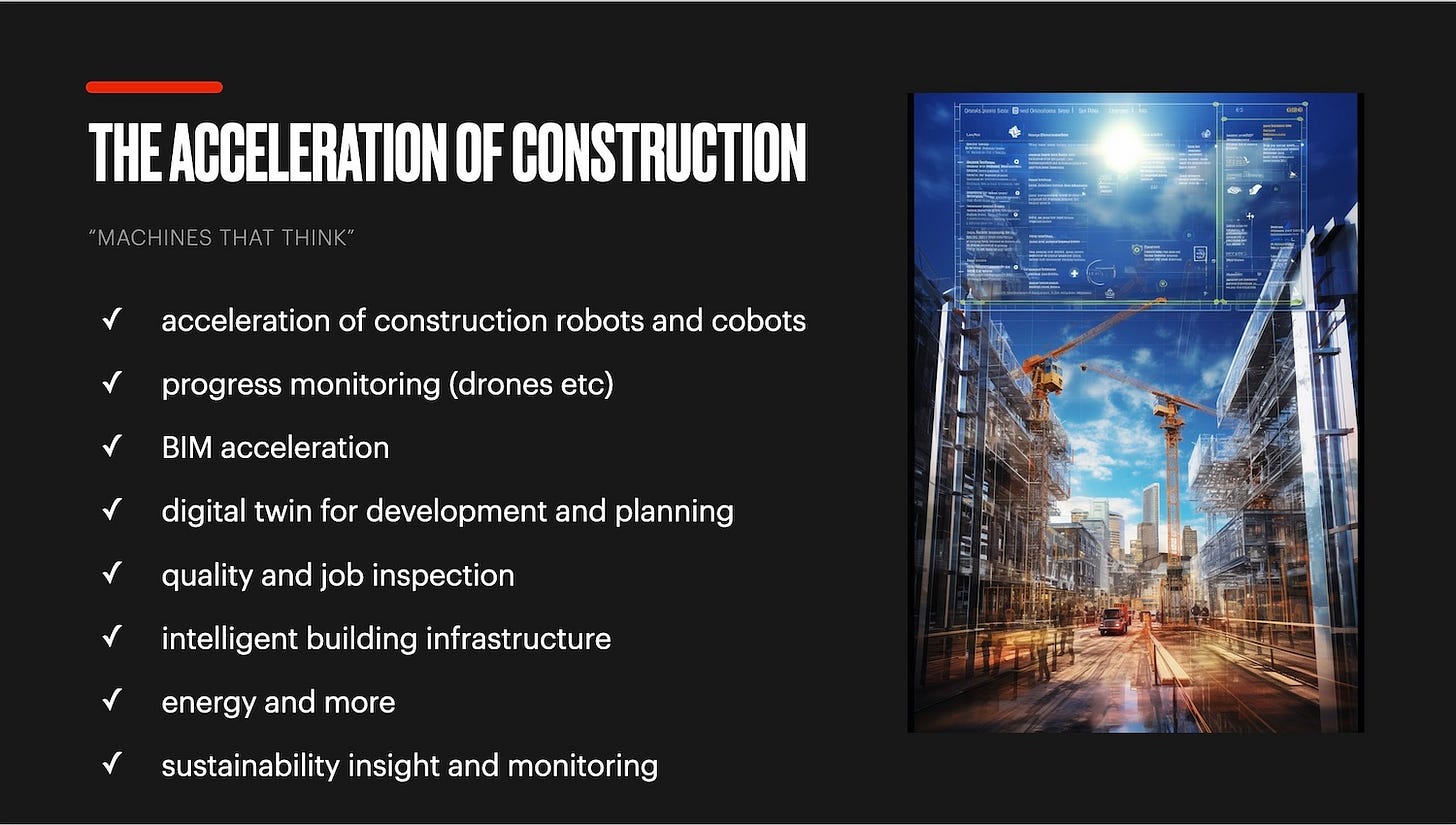 What does this involve? It's not just robots coming into construction; it involves changes to how we do things utilizing drone technology, more advanced BIM (Building Information Management) software, and digital twin technologies which allow us to virtualize much of the construction process as a way of better managing it, and much more.