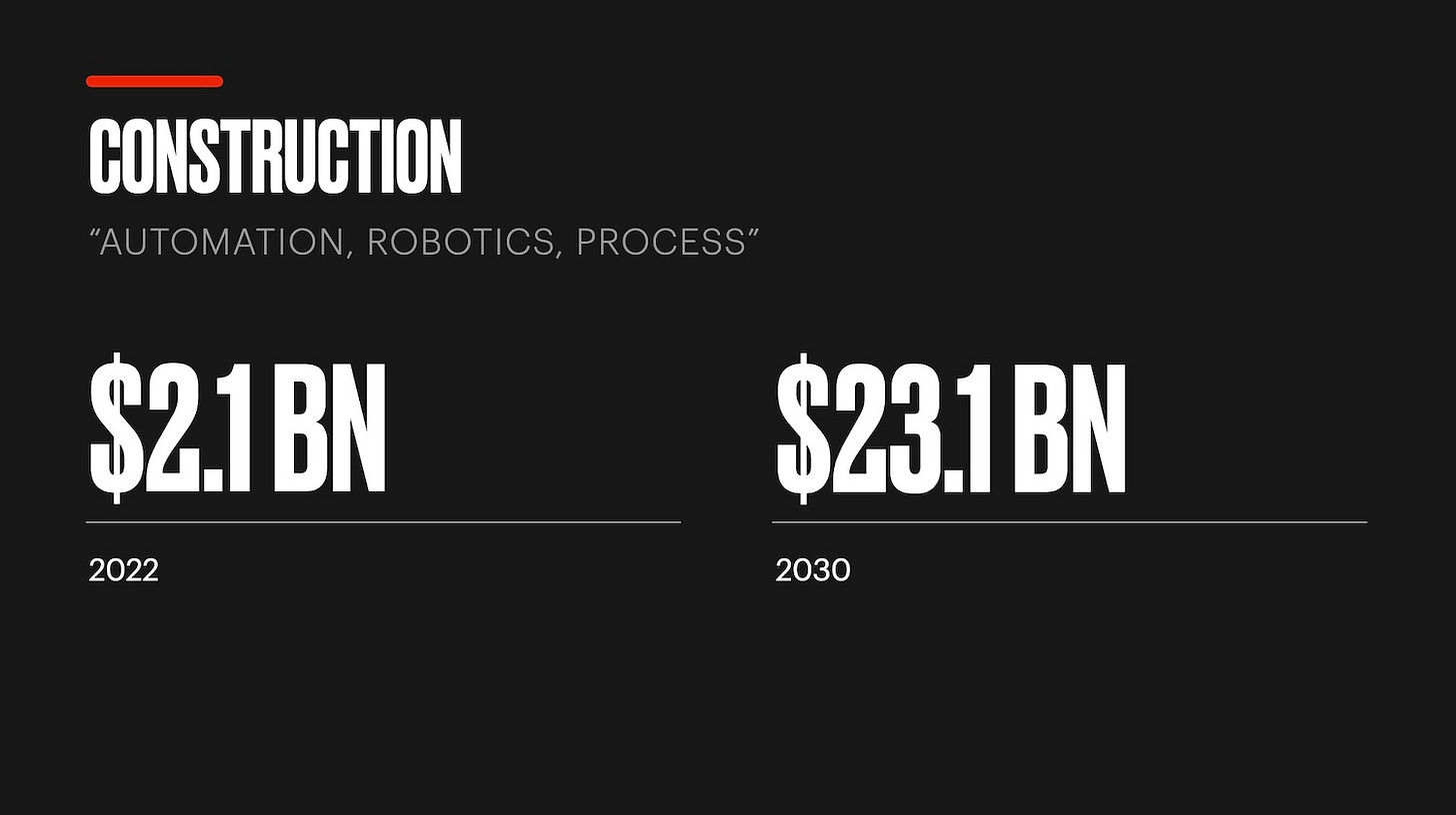A boring trend? Certainly not from an investment and spending perspective, as spending will go from $2.1 billion today to some $23.1 billion by 2030. Essentially, the construction sector is investing a HUGE amount of money in 'changing how things are done.'