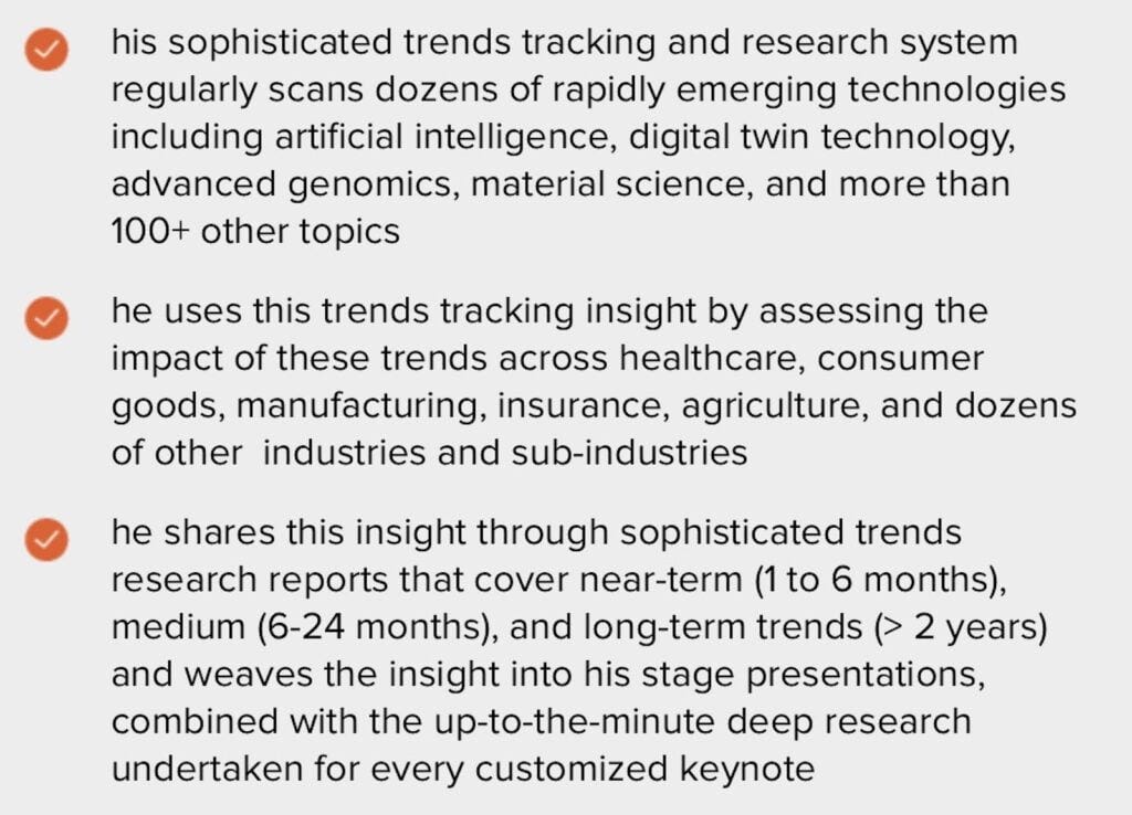 his sophisticated trends tracking and research system regularly scans dozens of rapidly emerging technologies including artificial intelligence, digital twin technology, advanced genomics, material science, and more than 100+ other topics