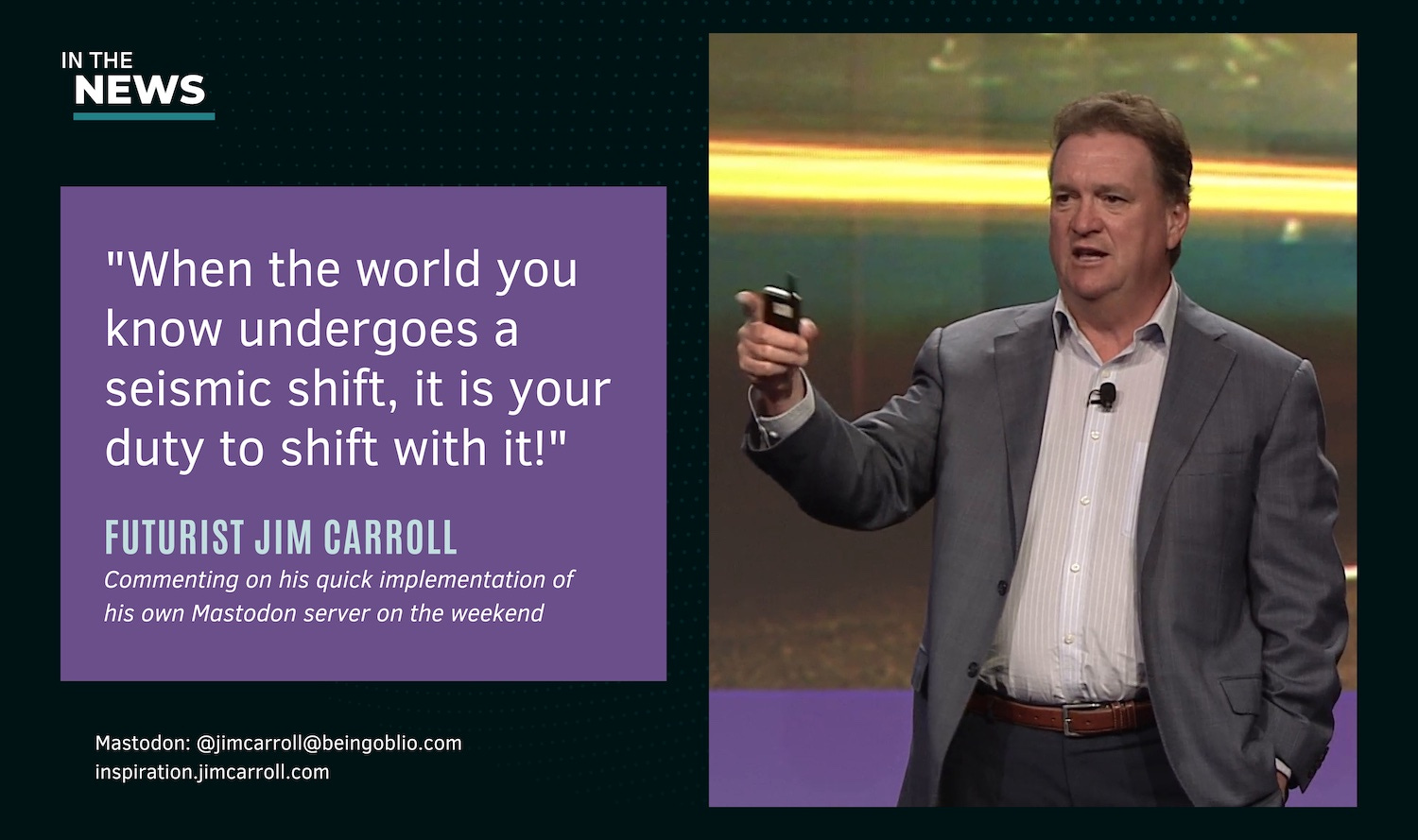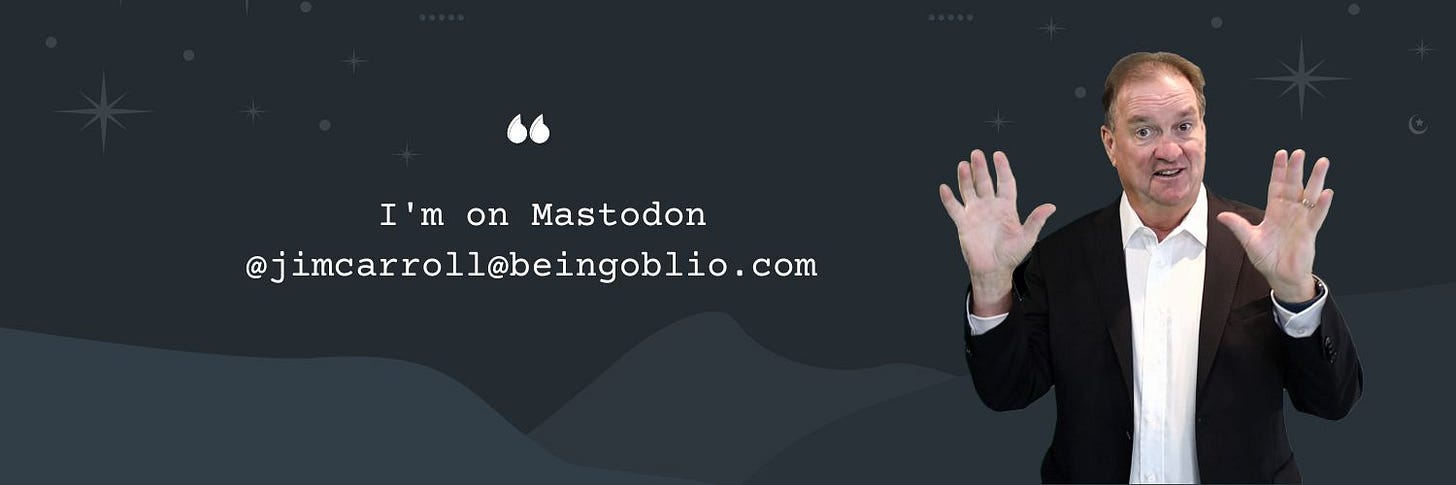 When you get there, toot me! (Ya, that's what it's called!) I'm @jimcarroll@beingoblio.com.