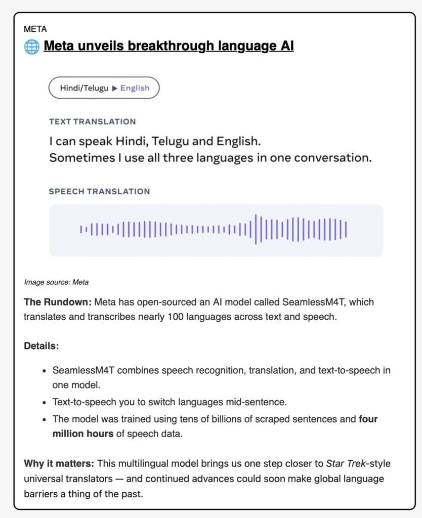 Even so, the pace of development is staggering. Some of the things I've seen just today include Meta announcing an AI platform that someone will inevitably use to release a real-time voice translation tool.
