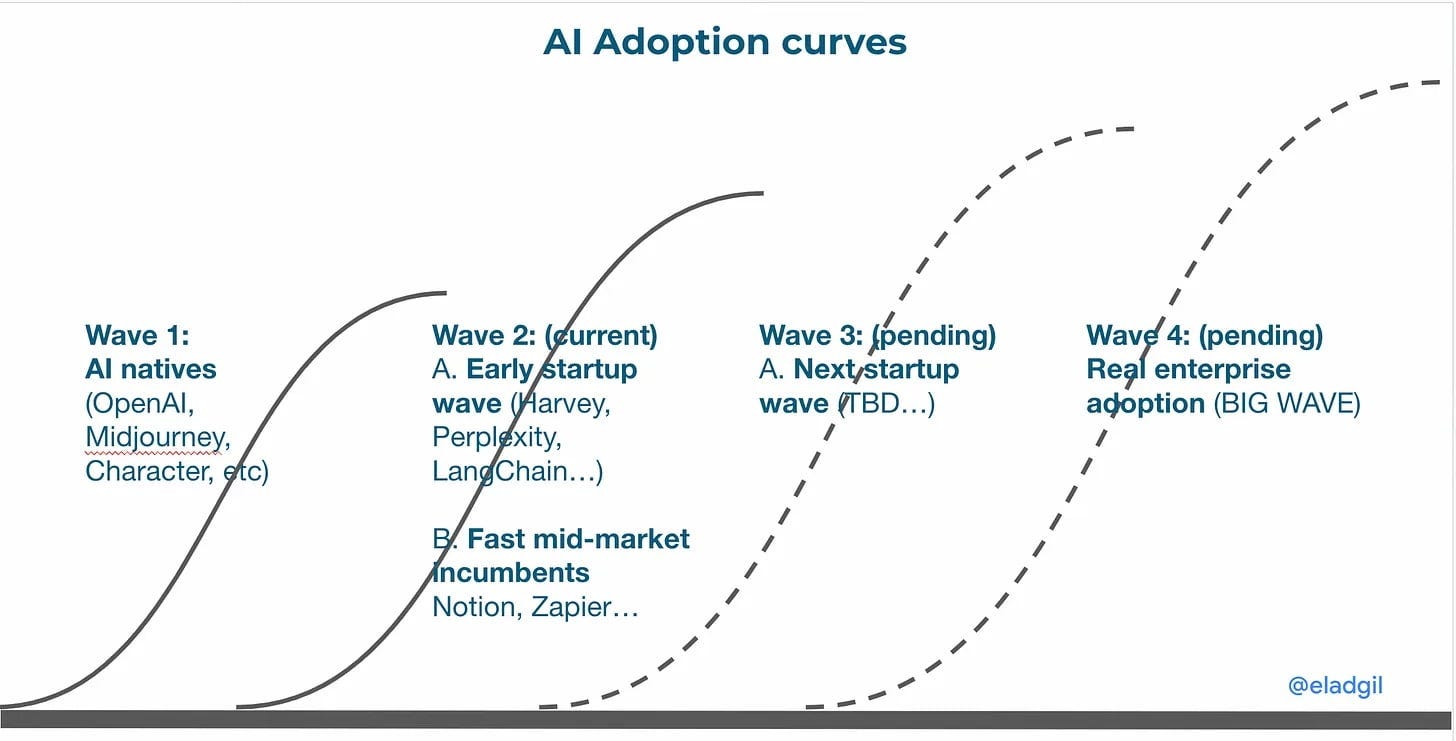 It's 1993 all over again, and it's important to keep in mind that while we saw a similar explosion of announcements, it wasn't until '95, '96, and beyond that, we started to see real applications of substance. This is where the predictions of Elad Gil bear relevance. From his post: