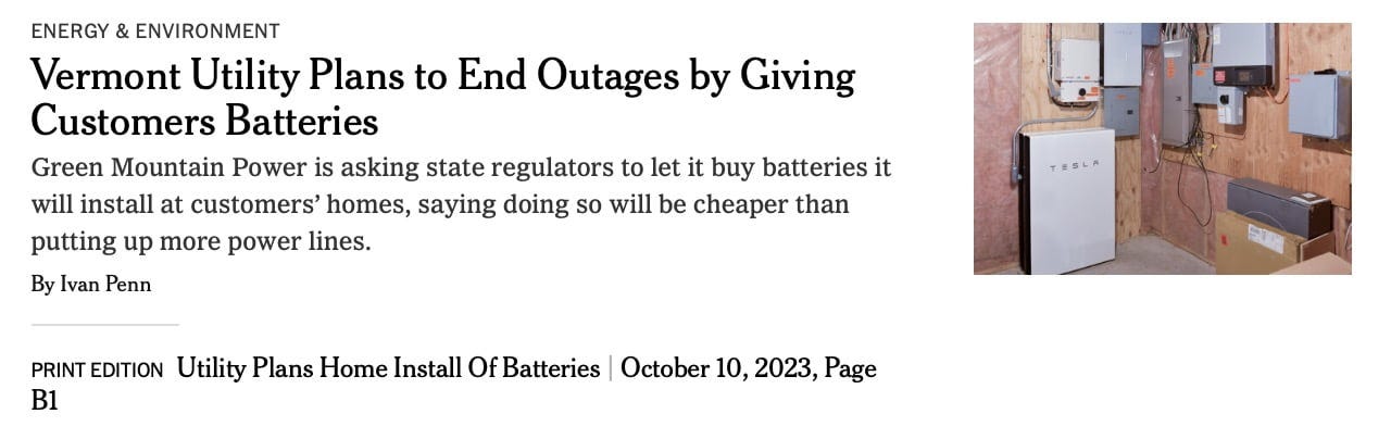 That's why an article in the New York Times yesterday drew my attention, noting that a utility in Vermont plans on solving the issue of having to deal with an increasing number of power outages by ... not having to deal with an increasing number of power outages. Their solution? Rather than stringing and fixing more utility lines, let's give the customers batteries to store energy for use in these situations!