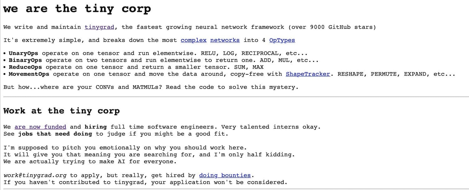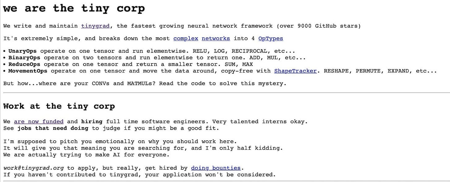 There’s only one way to get hired at the tiny corp, and that’s by submitting high quality pull requests to tinygrad. Job interviews are obsolete, prove you can do the job by doing the job!