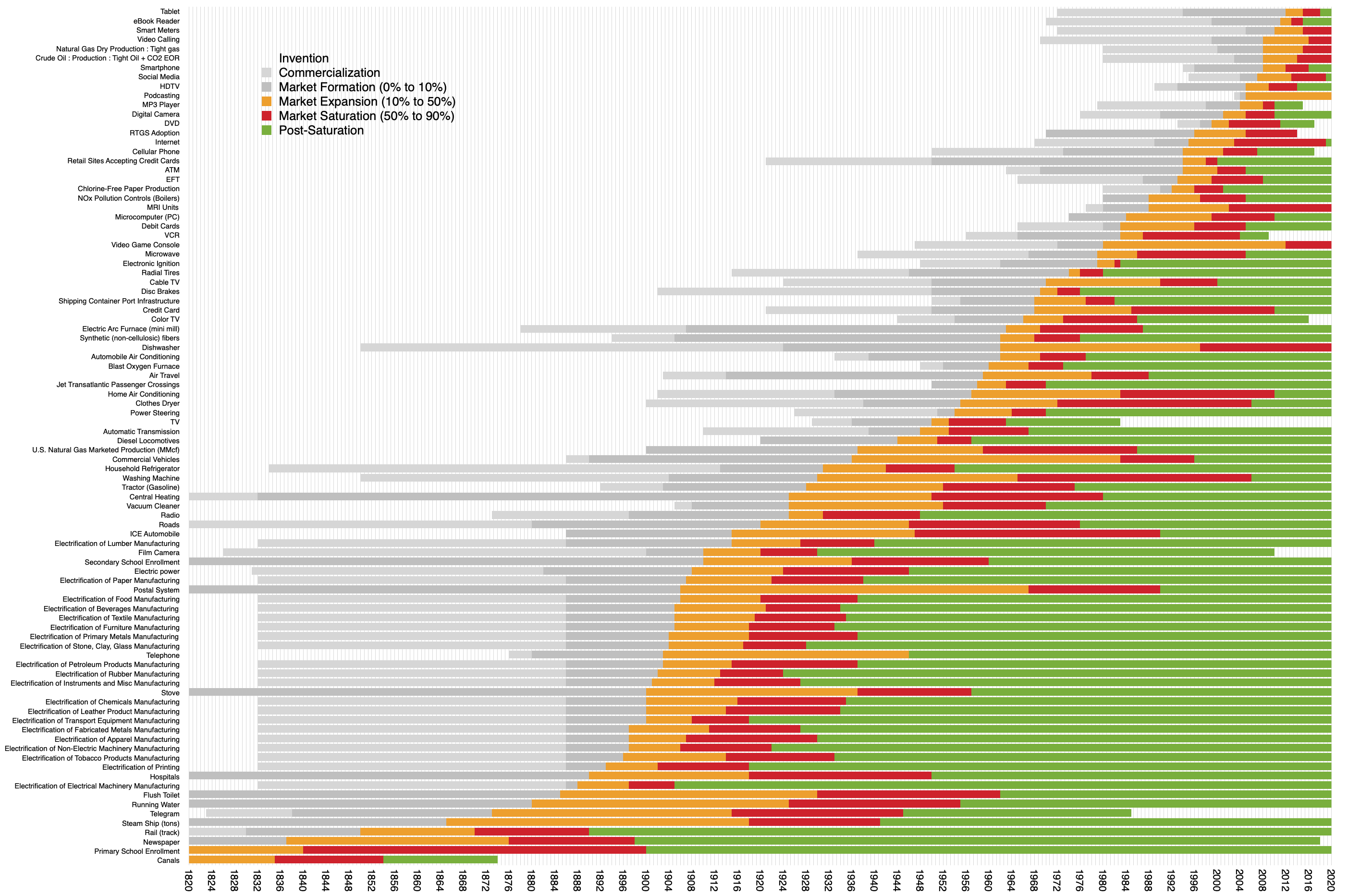 The first, although very difficult to see, has to do with the history of how quickly new products come to market, achieve market dominance, and are then replaced or hit market maturity. It's pretty clear that longevity is disappearing.